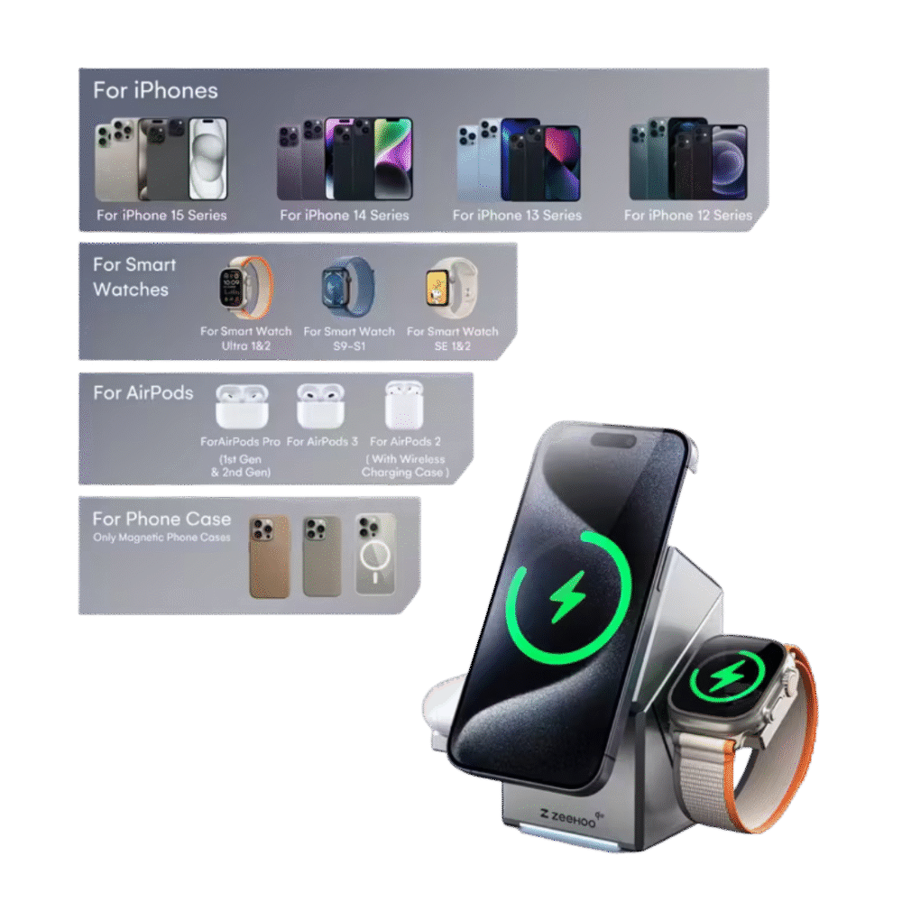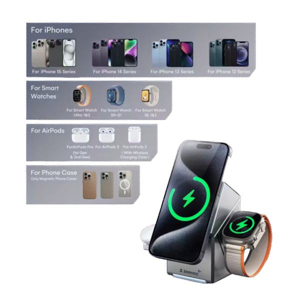 Cross-Device Compatibility — supports iPhones, wireless charging-enabled earbuds, and smartwatches